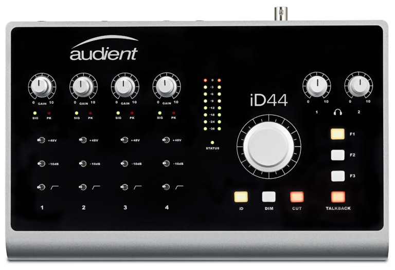 O iD44 é o interface mais poderoso da AUDIENT, na linha dos clássicos iD22, 14 e 4. Este modelo contém os mesmos pré-amplificadores classe C, que equipam os demais produtos da AUDIENT (inclusivamente as mesas de estúdio como a ASP8024-HE), mas acrescenta-lhe novos conversores, concebidos para reproduzir uma banda dinâmica mais alargada, 4 canais de microfone e duas entradas JFET D.I, desenhadas para replicar as entradas dos amplificadores de válvulas. Completam-no as 4 saídas de linha e os 2 inserts balanceados (que permitem ligação a equipamento analógico externo) e duas saídas para ausucultadores.